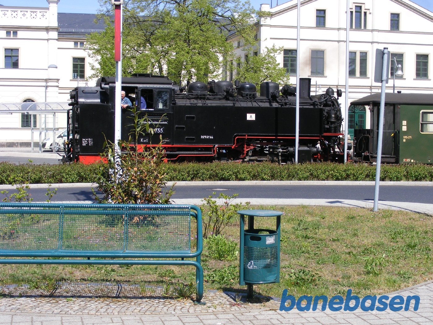 Motiv:Zittau Station. Damplokomotiv 99 735 med tog ankommer