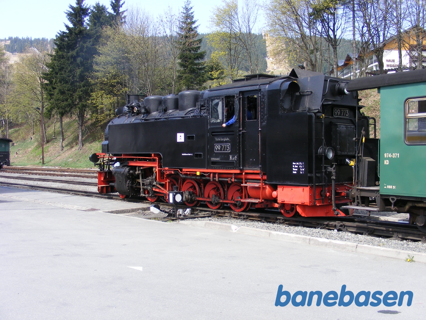 Motiv:Fichelbergbahn. Oberwiesenthal station. Damplokomotiv med tog klar til afgang