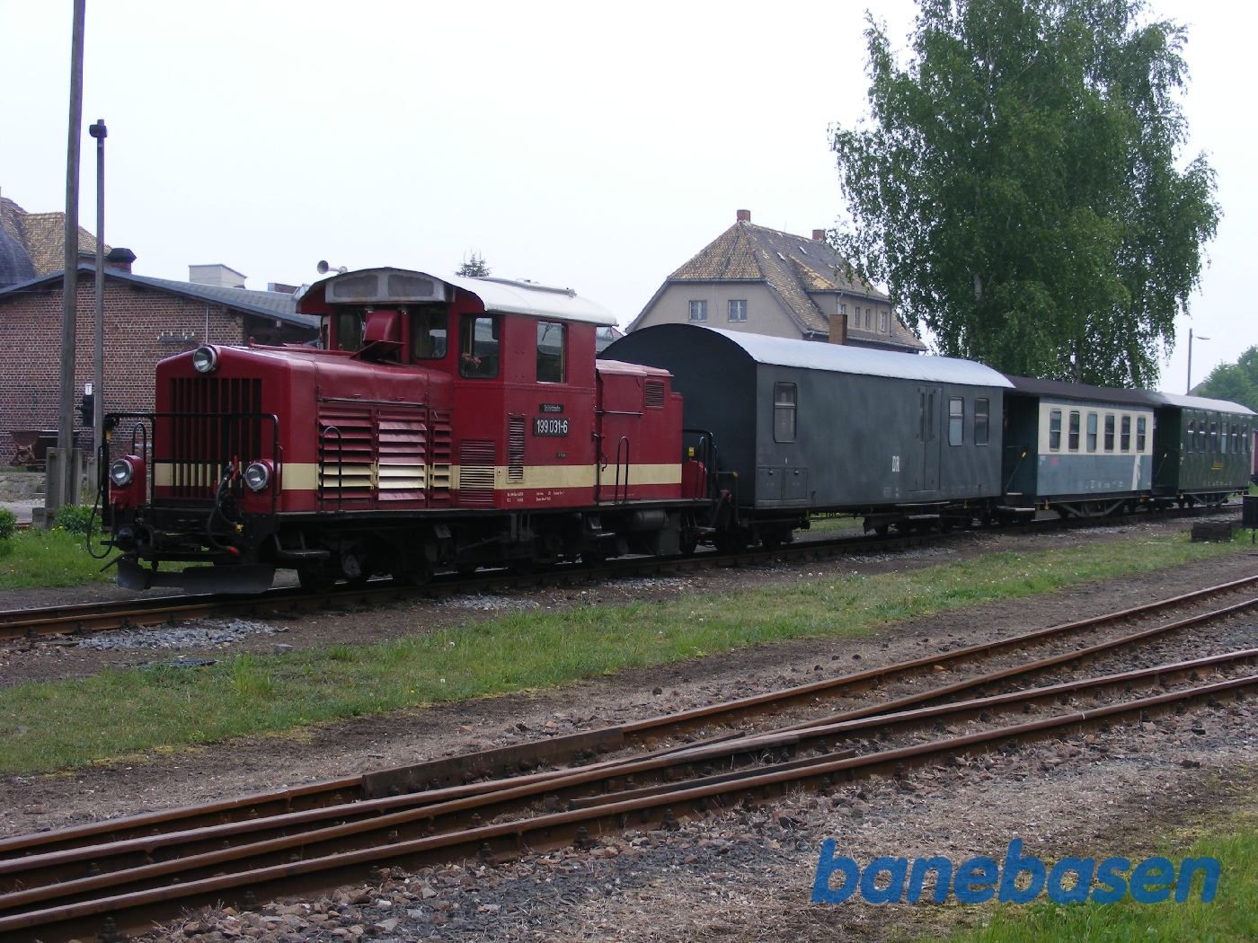 Dollnitzbahn. Mügeln station. Motorlokomotiv med tog afgår