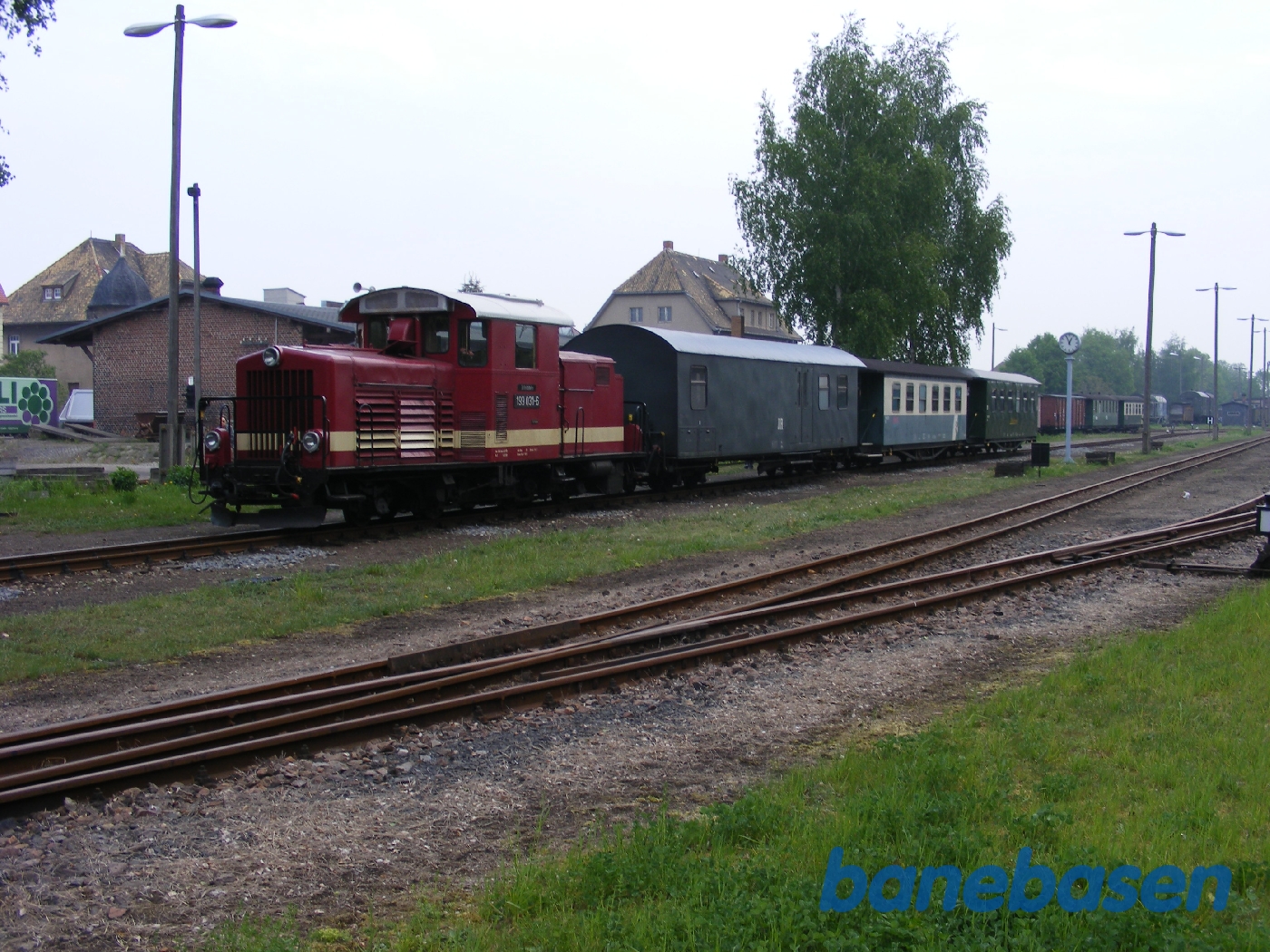 Dollnitzbahn. Mügeln station. Motorlokomotiv med tog afgår