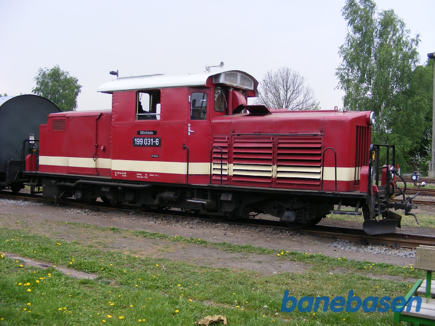 Dollnitzbahn. Mügeln station. Motorlokomotiv med tog afgår
