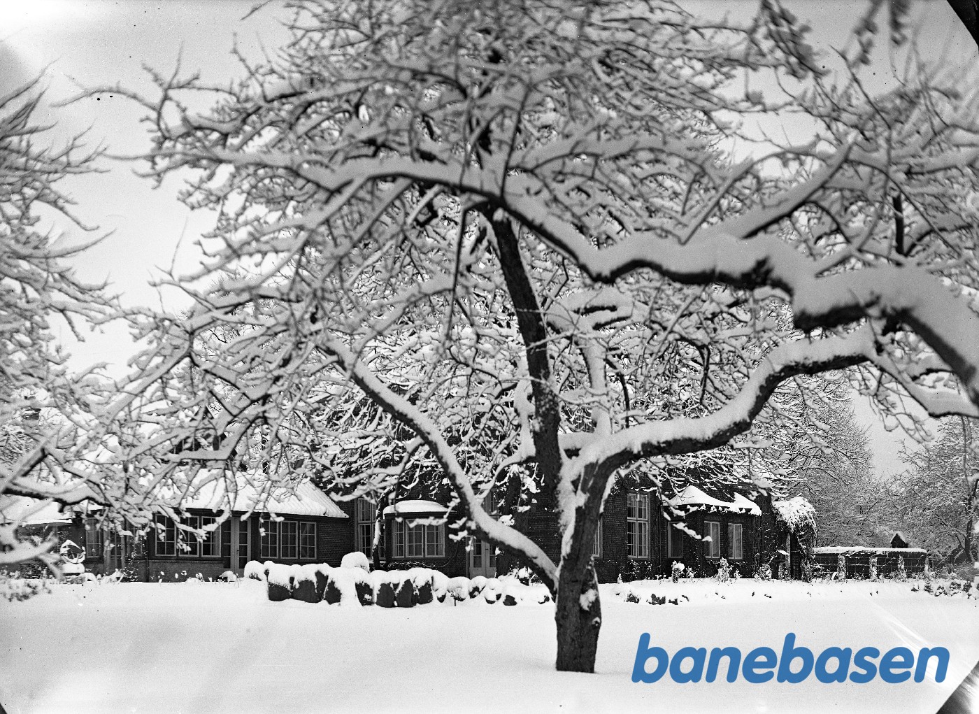 Vinterbillede. Due-Petersens villa med træ foran