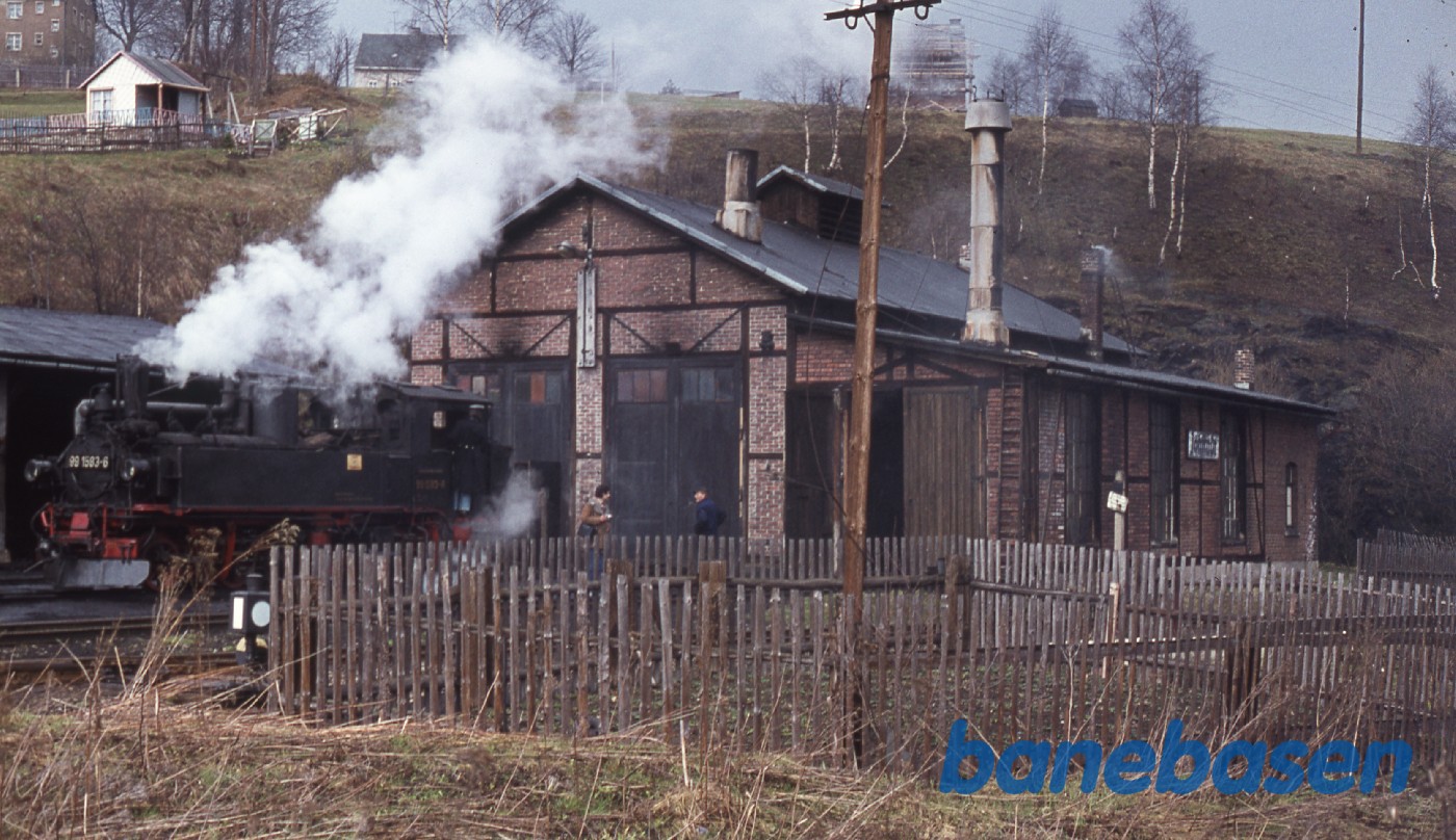 Motiv:Damplokomotivet holder foran remisen i Jöhstadt