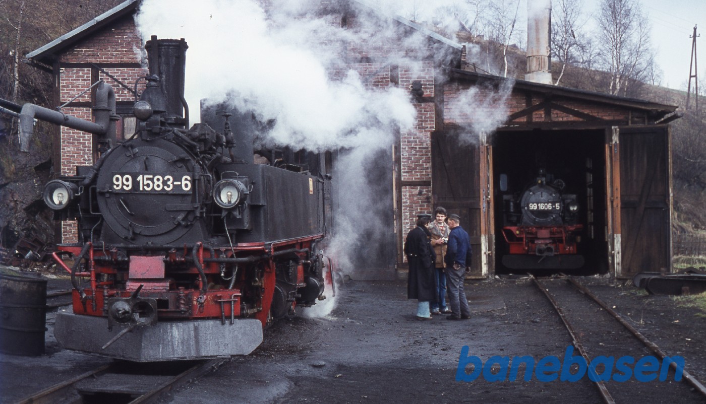 Motiv:Damplokomotivet holder foran remisen i Jöhstadt