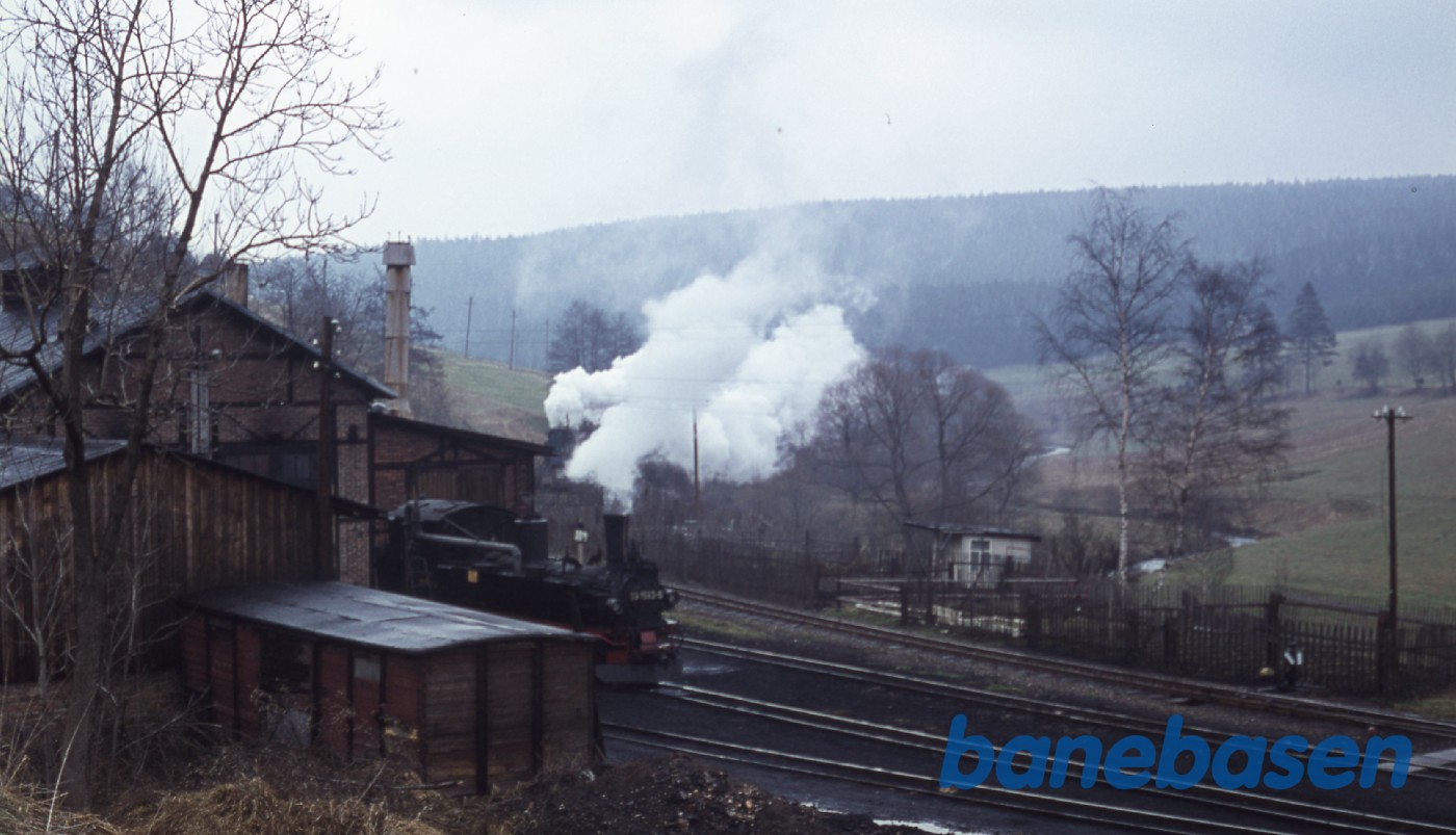 Motiv:Damplokomotivet holder foran remisen i Jöhstadt
