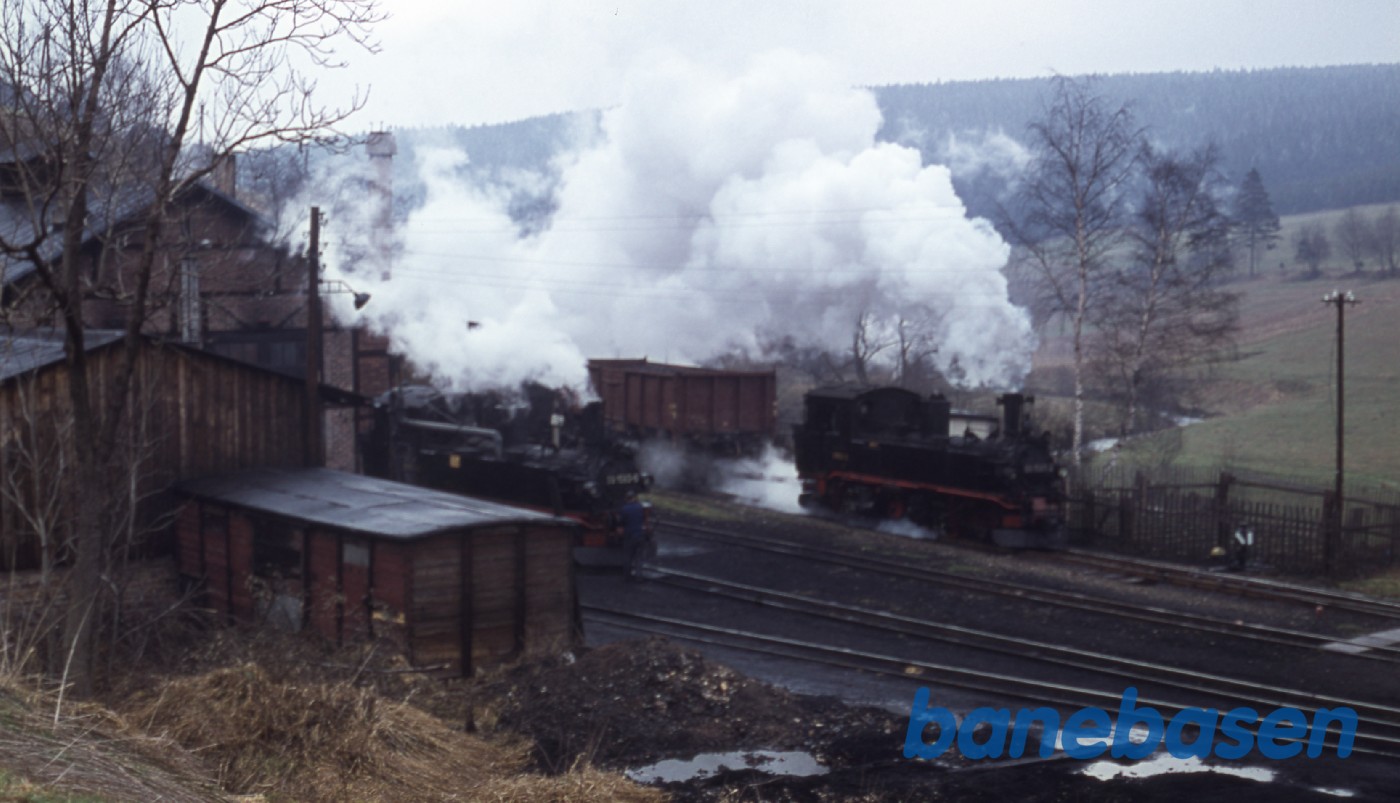 Motiv:Damplokomotivet holder foran remisen i Jöhstadt. Godstog på vej ind
