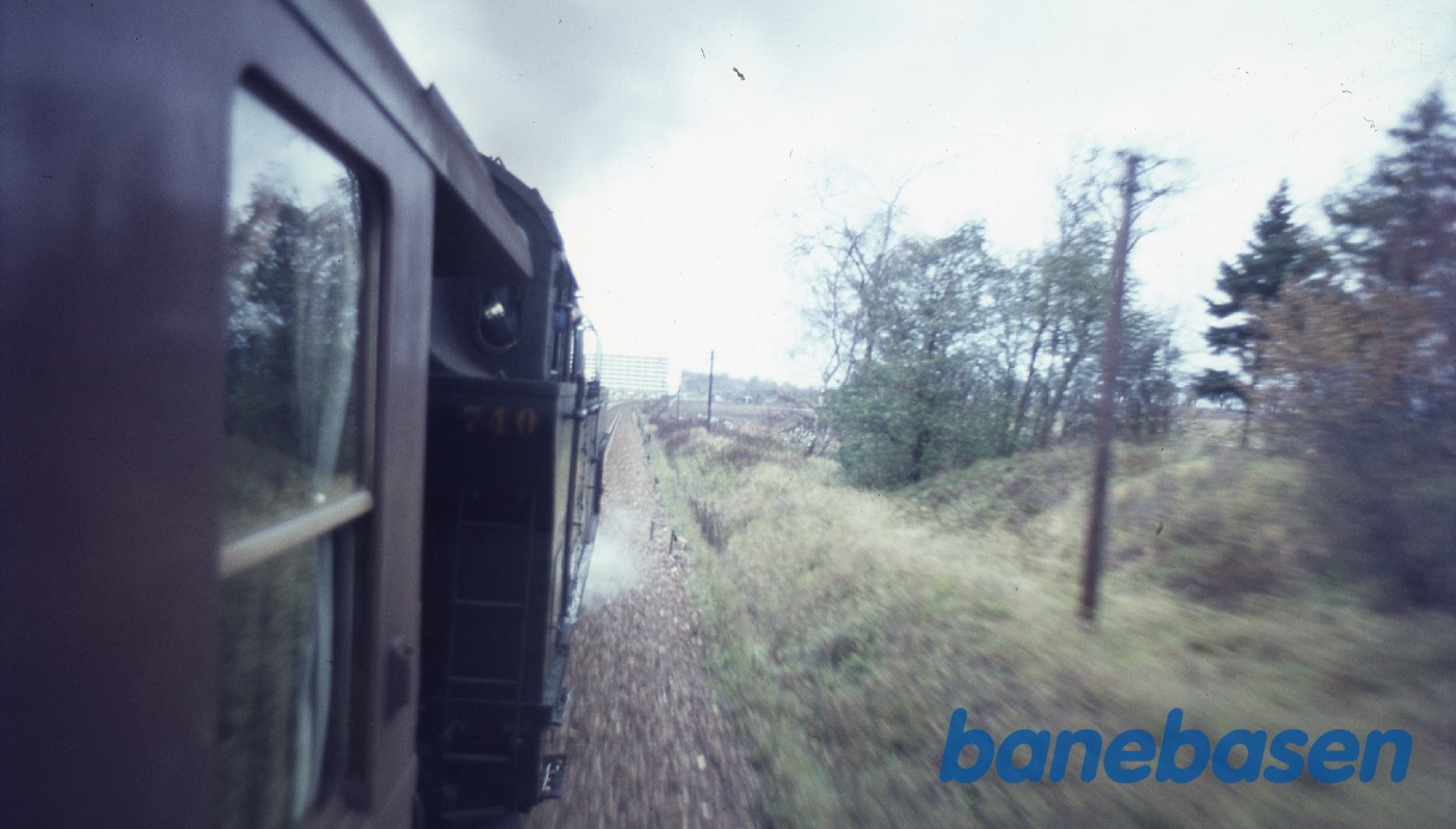 Damptog et sted på Kystbanen set ud af vinduet