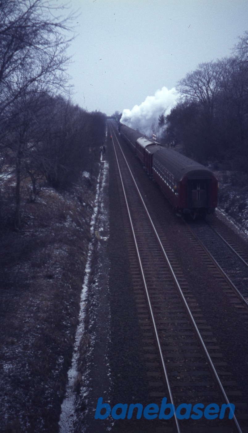 Motiv:Det er enten Kong Frederik IX´s båretog eller prøvekørslen af dette i januar 1972. Sted nok mellem Taastrup og Hedehusene