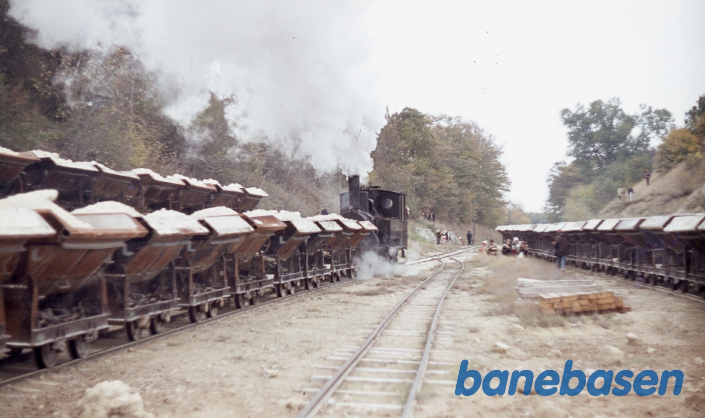 | Motiv: | Damplokomotiv trækker af sted med læssede kalkvogne nede i kalkbrudet |