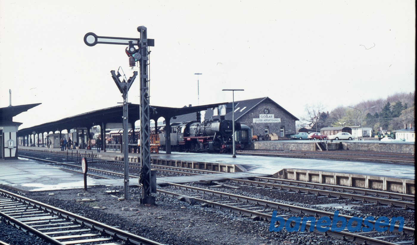 Goslar, damplokomotiv holder i sidesporet. Armsignal i forgrunden