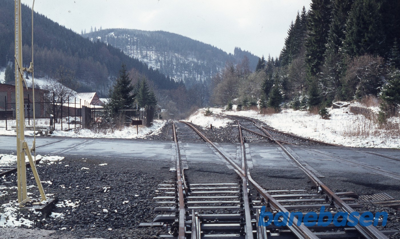 Andreasberg, sporene der går ud af stationen. Sneklædte bjerge i baggrunden