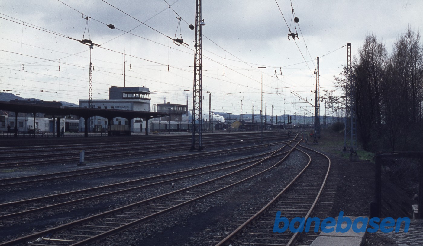 Foto ud over stationsområdet, damplokomotiv i baggrunden