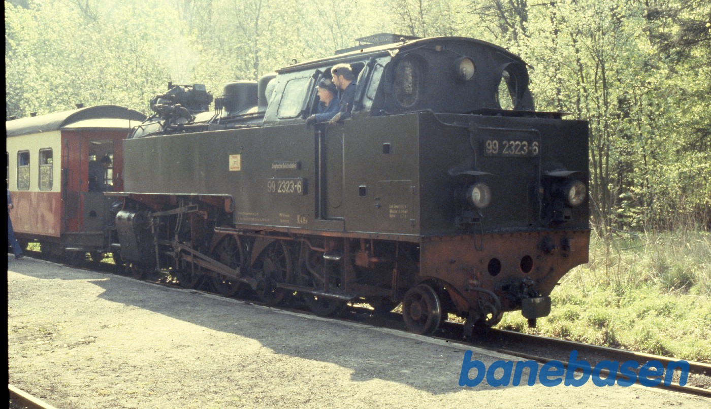 Motiv:Toget afventer krydsning. Fyrbøderen kigger ned langs toget