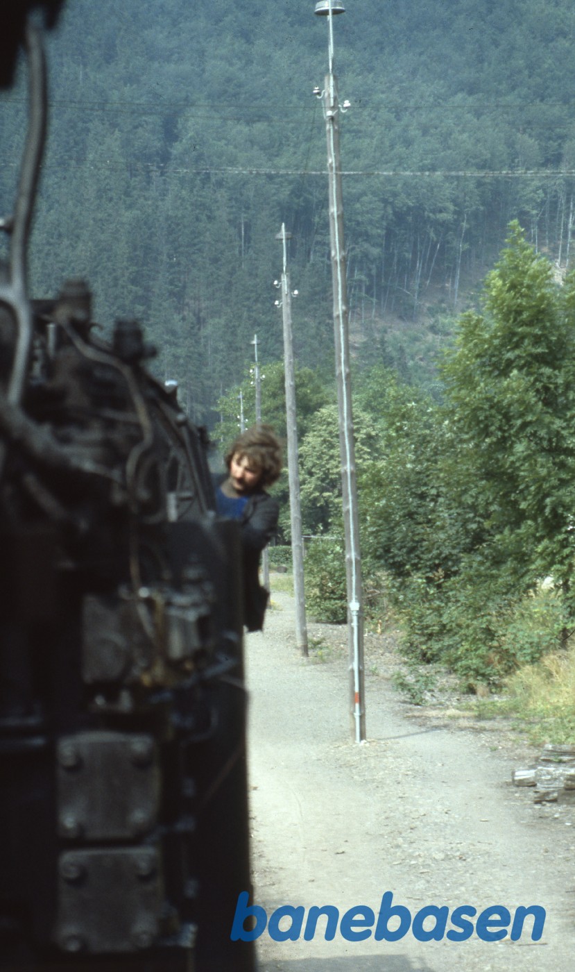Motiv:Foto frem langs toget. Harzen bjergene rejser sig ude i horisonten