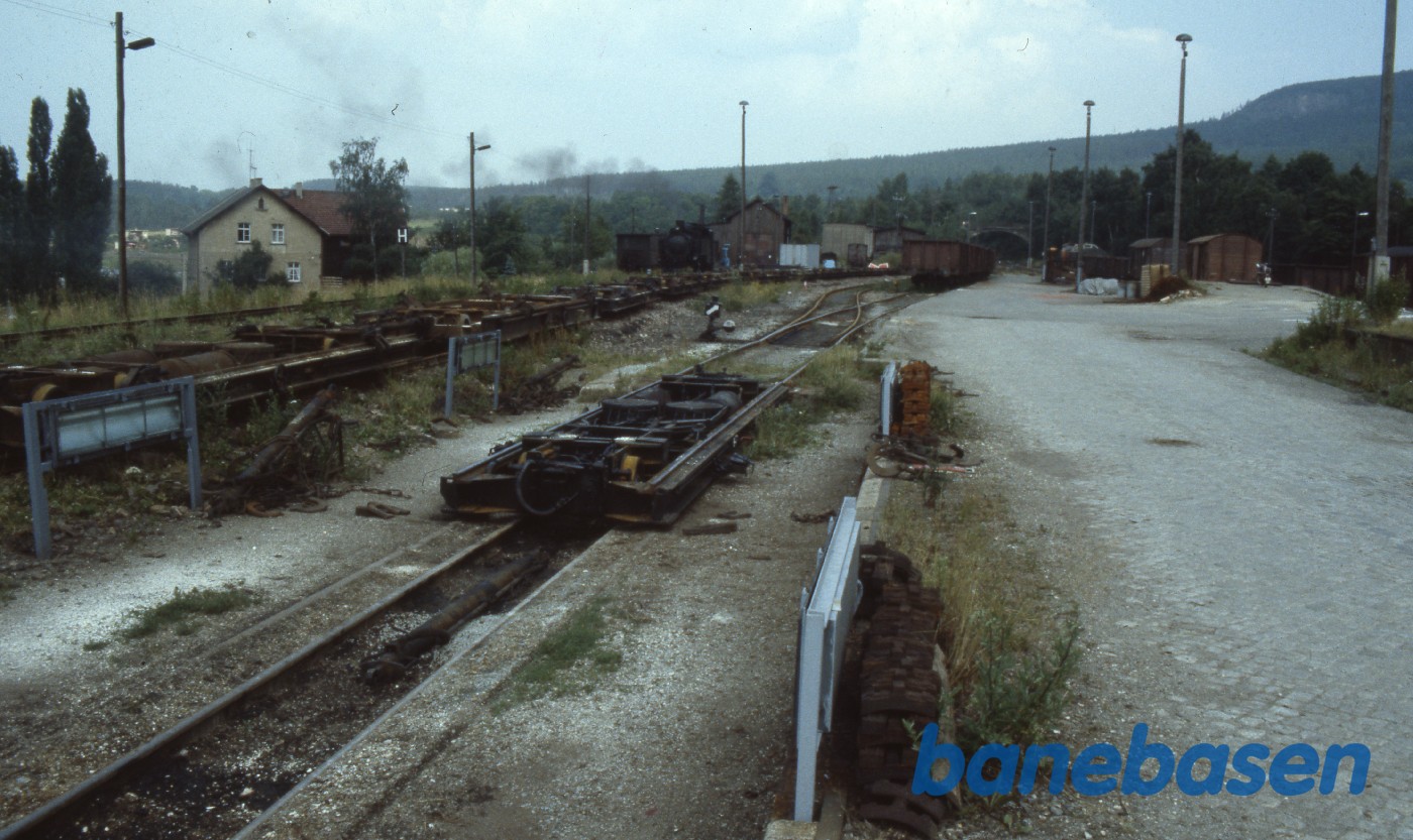 Udsigt ud over stationsområdet med overførselsvogne til normalsporet materiel