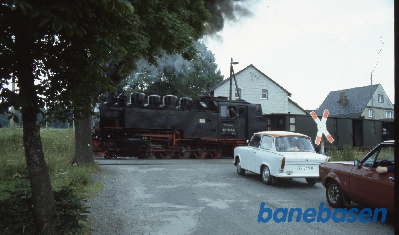 Ubevogtet overkørsel med Trabant. Persontoget på vej ud af en lille station på strækningen Cranzahl - Oberwiesenthal