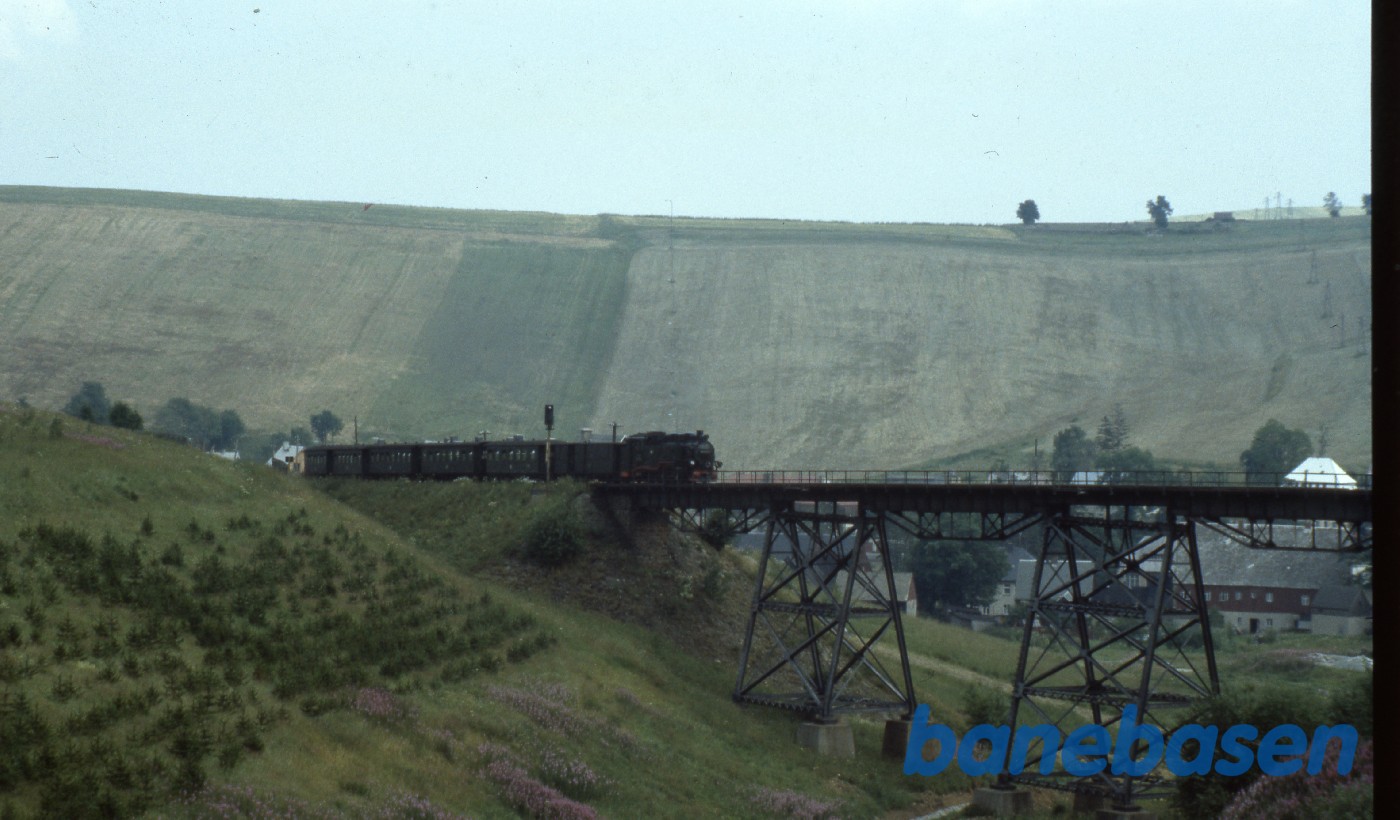 Motiv:Persontog fra Cranzahl mod Oberwiesenthal er på vej over den store bro ligefør stationen