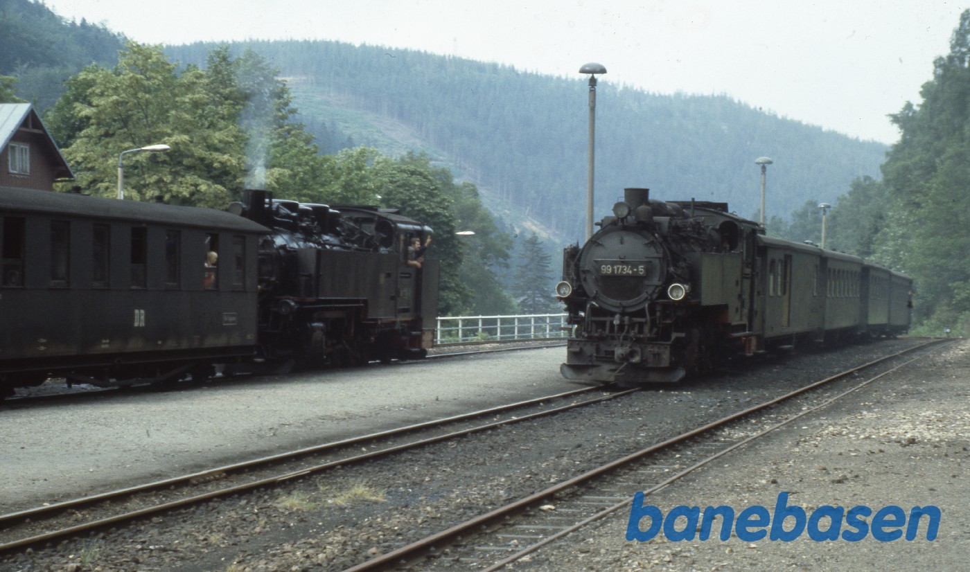 Motiv:Persontoget ankommer til endestationen mens andet damptog holder klar til afgang mod Freital