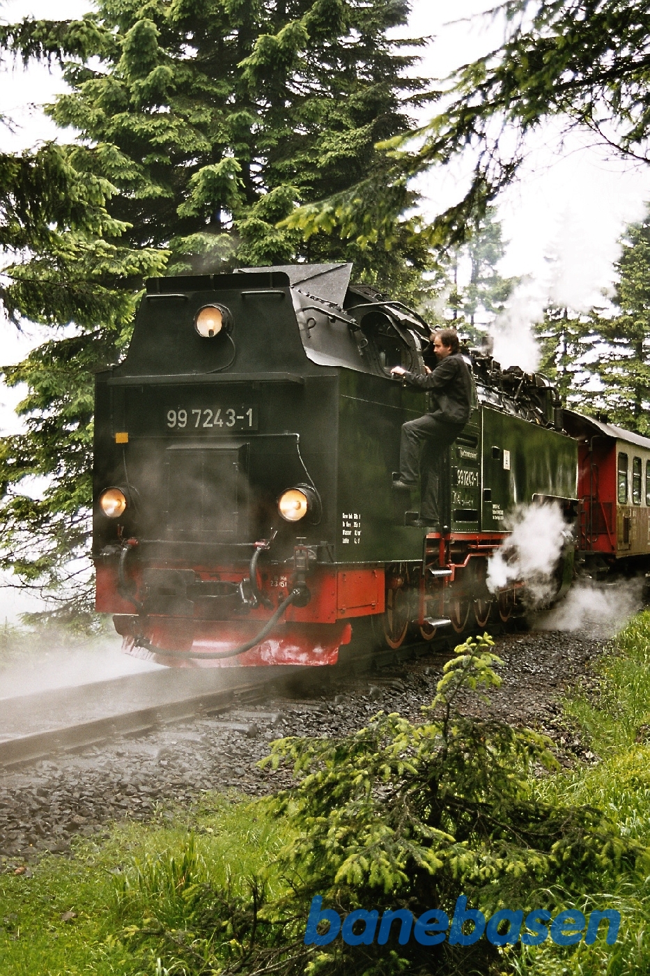 Motiv:Damptoget i skoven mens fyrbøderen kravler rundt på lokomotivet
