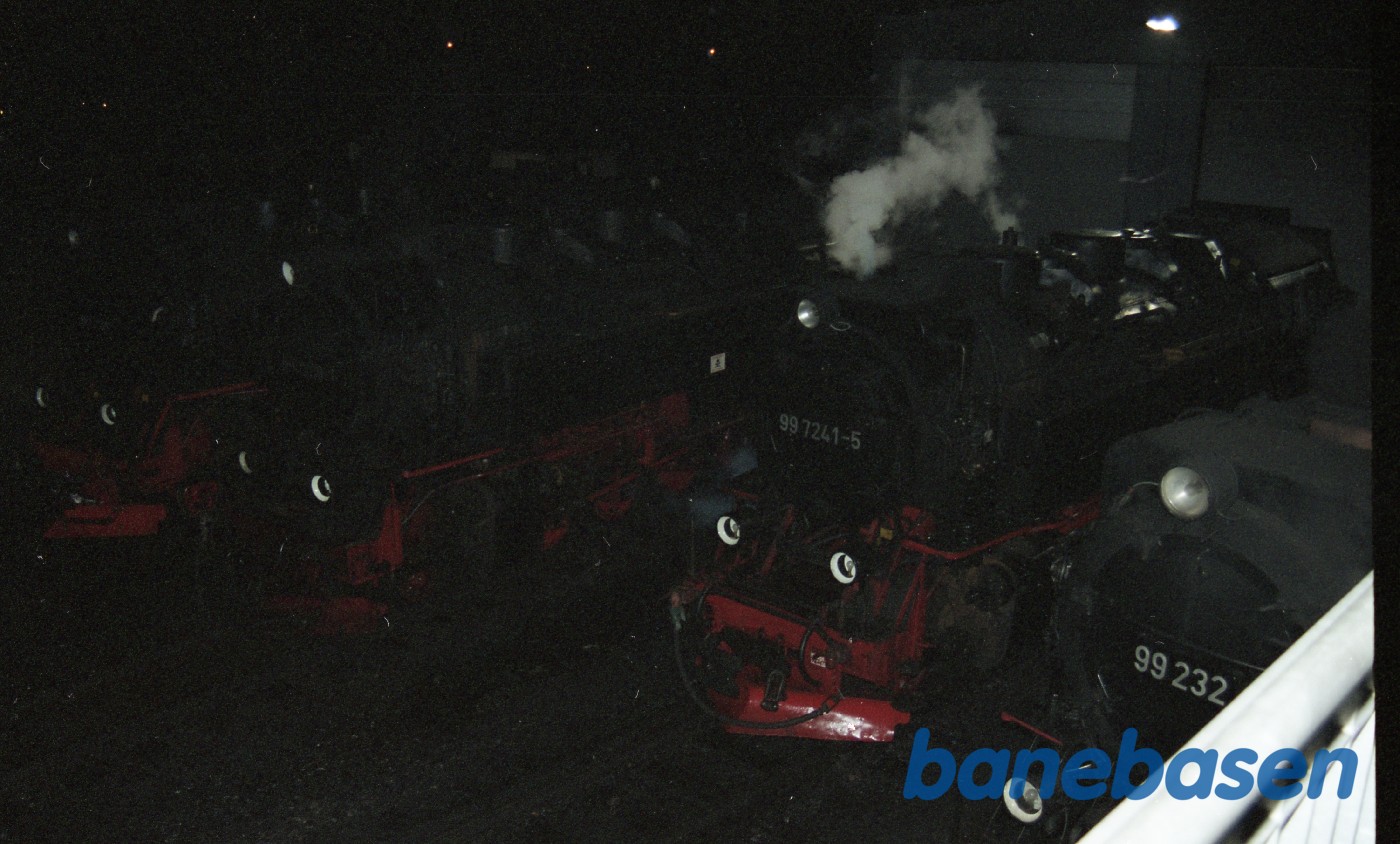 Motiv:Flere damplokomotiver står i mørket på maskindepotet