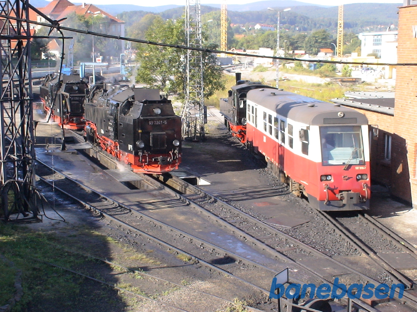 3 Damplokomotiver og en motorvogn på maskindepotet