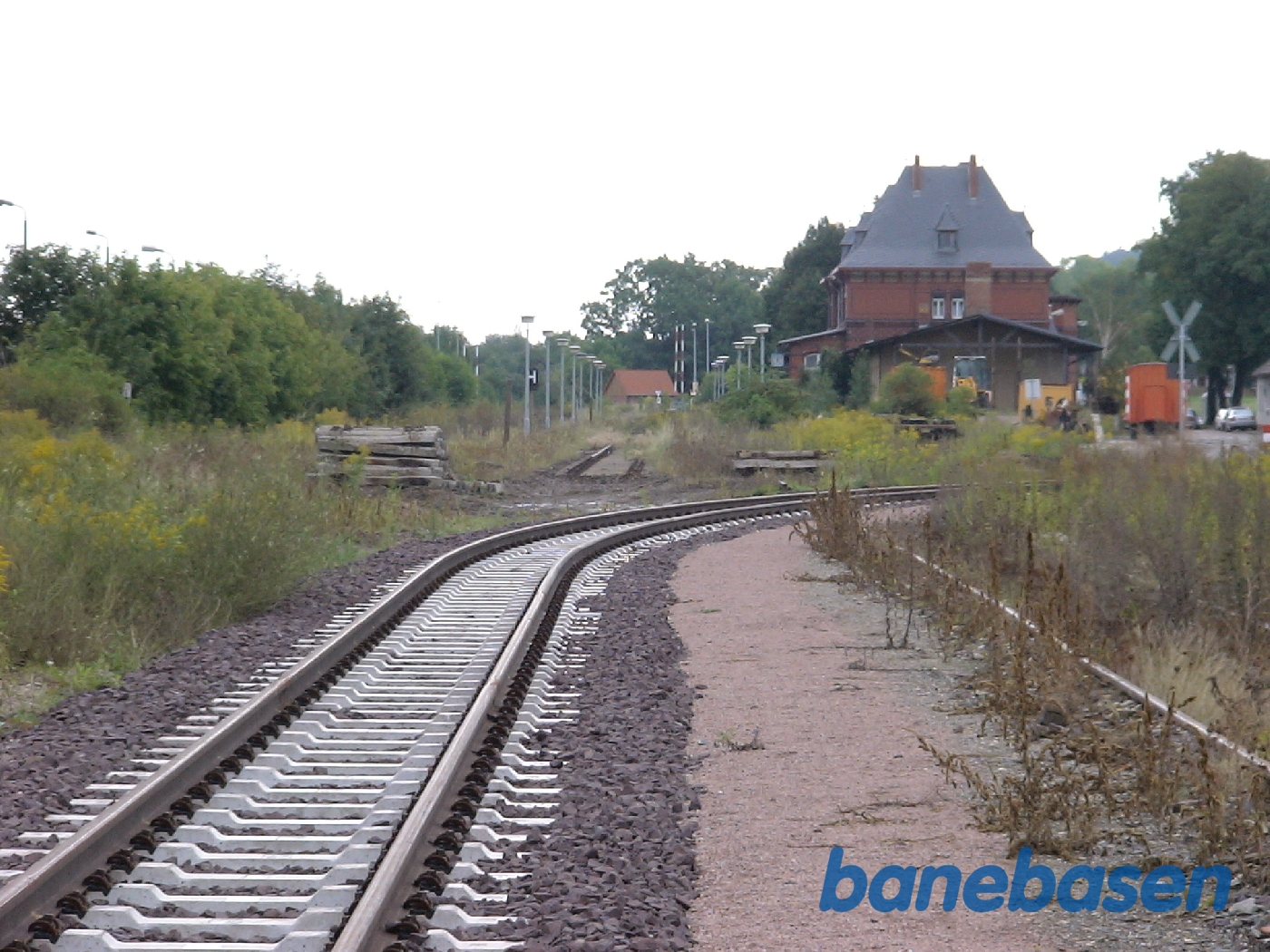 Motiv:Den omlagte normalsporsbane til meterspor, hvor ny bane går udenom den gamle stationsbygning