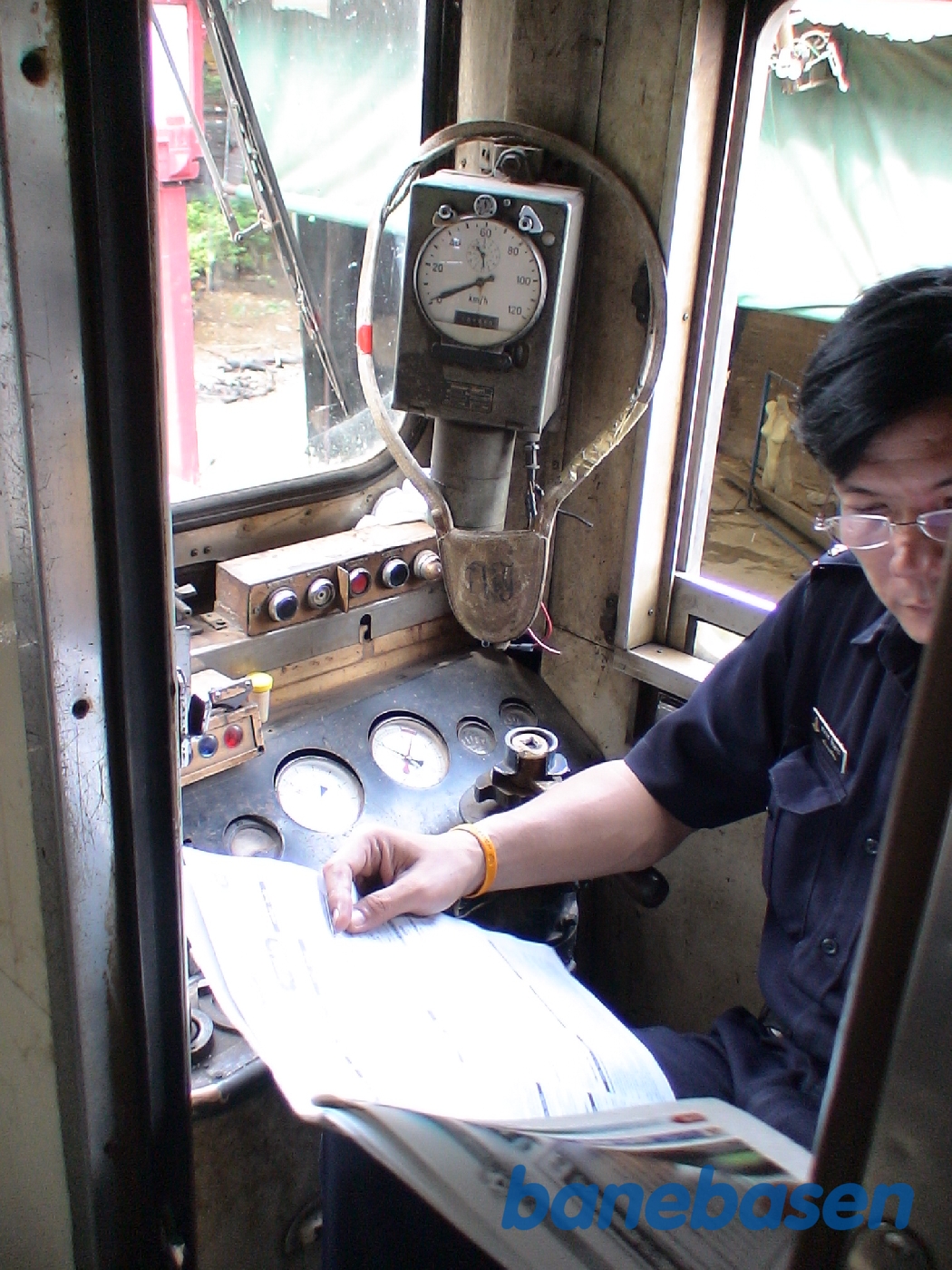 Persontoget holder på stationen lige før broen. Lokomotivføreren læser avis