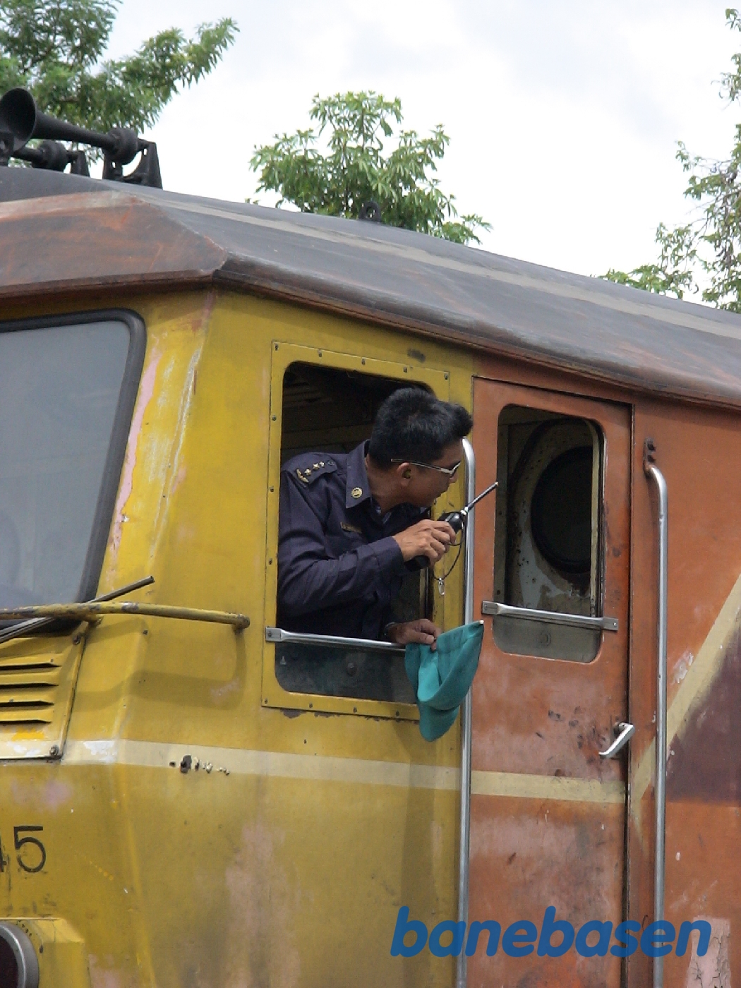 Motiv:Persontoget holder på stationen lige før broen. Lokomotivføreren snakker i radioen
