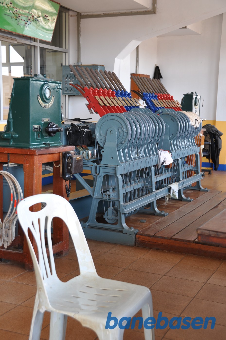 Det gamle sikringsanlæg med wiretræk samt maskinen til "togstaven"