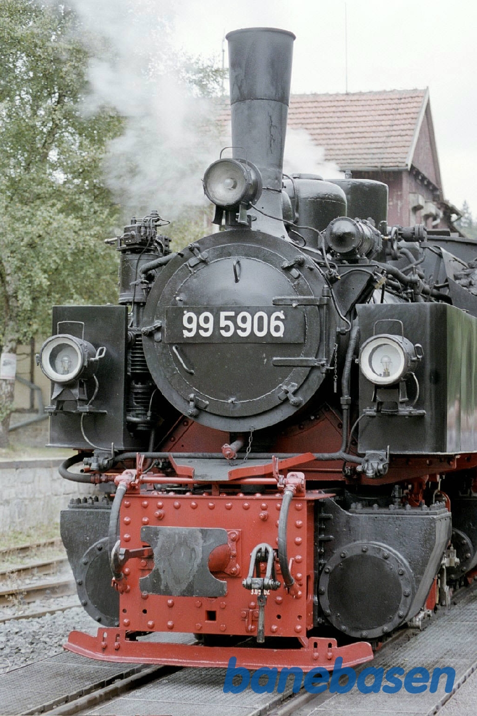 Damptoget ved perron. Fronten på lokomotivet
