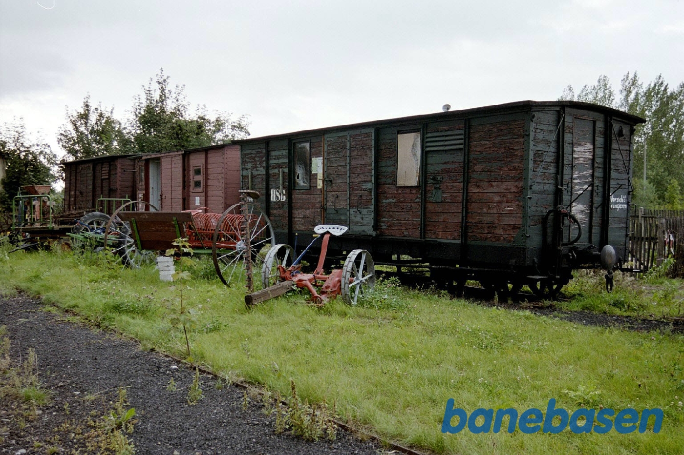 Godsvogne i sidesporet og landbrugsmaskiner udstillet