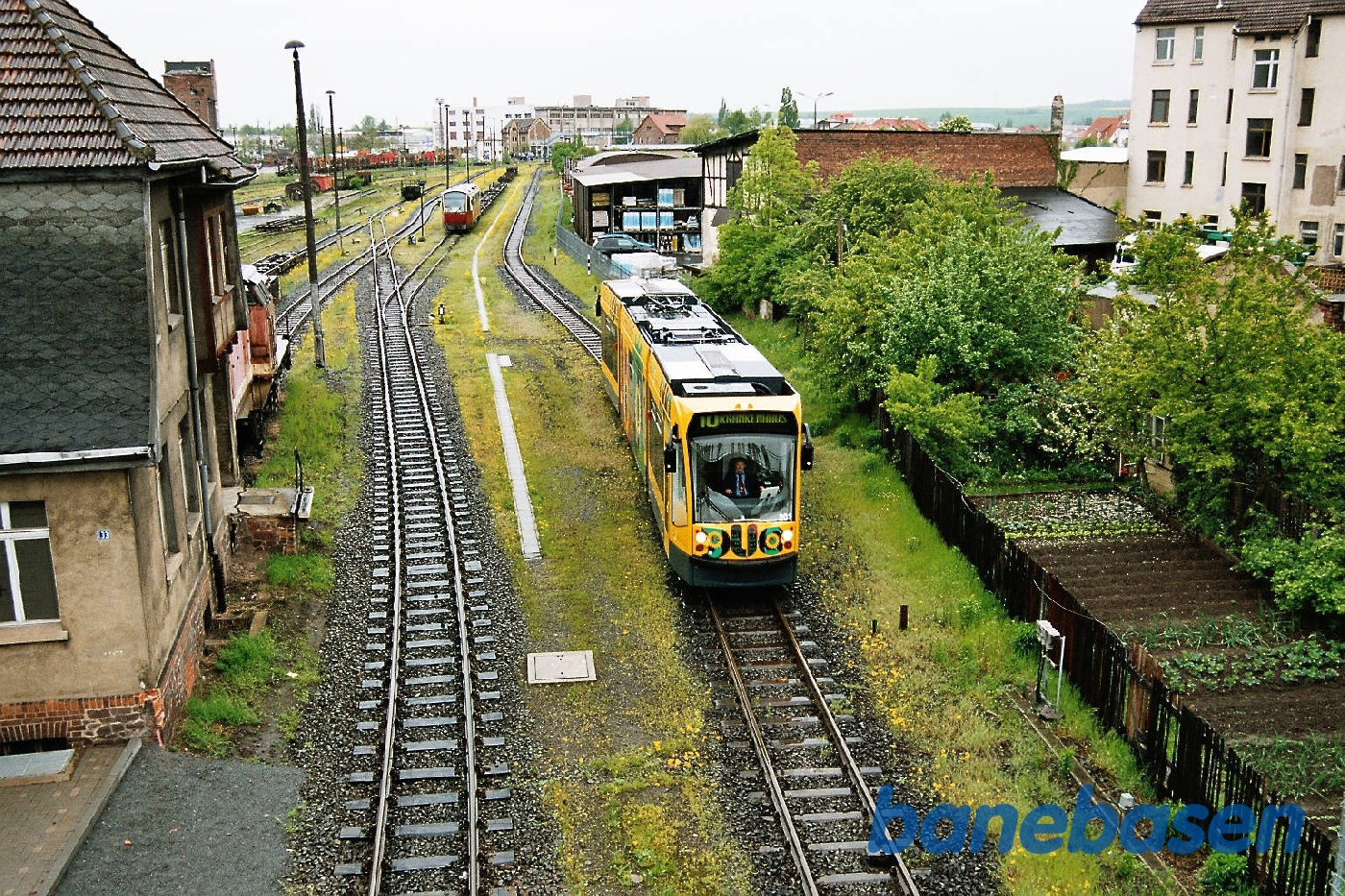 Vue ud over maskindepotet, sporvogn på vej ind i byen