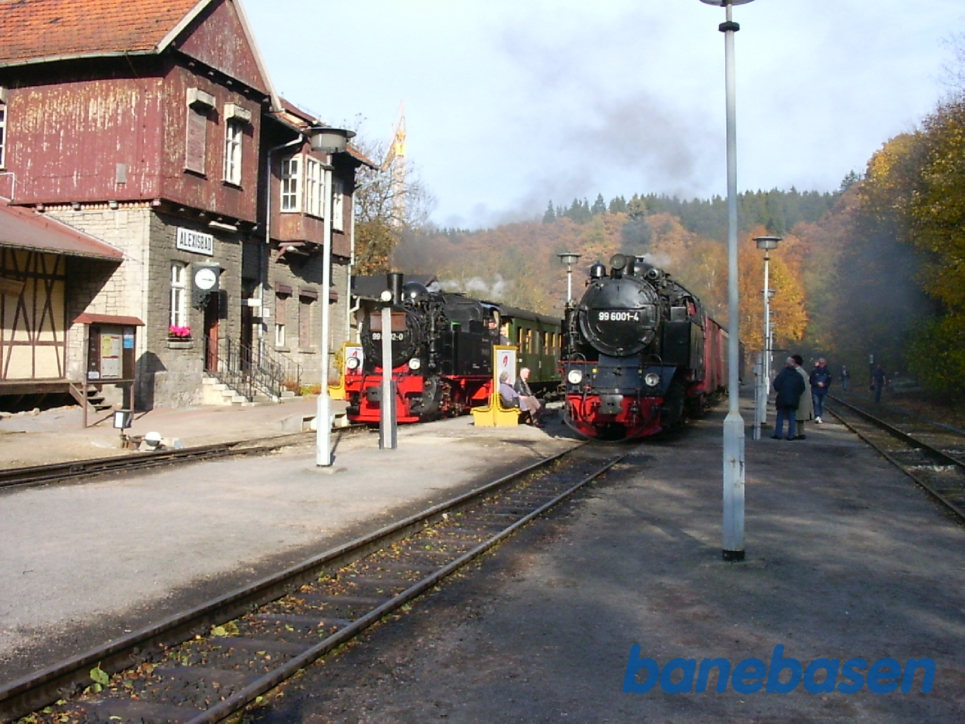 Motiv:Damptoget holder ved perron 1, klar til at køre til Hasselfelde. Toget i spor 2 skal til Harzgerode