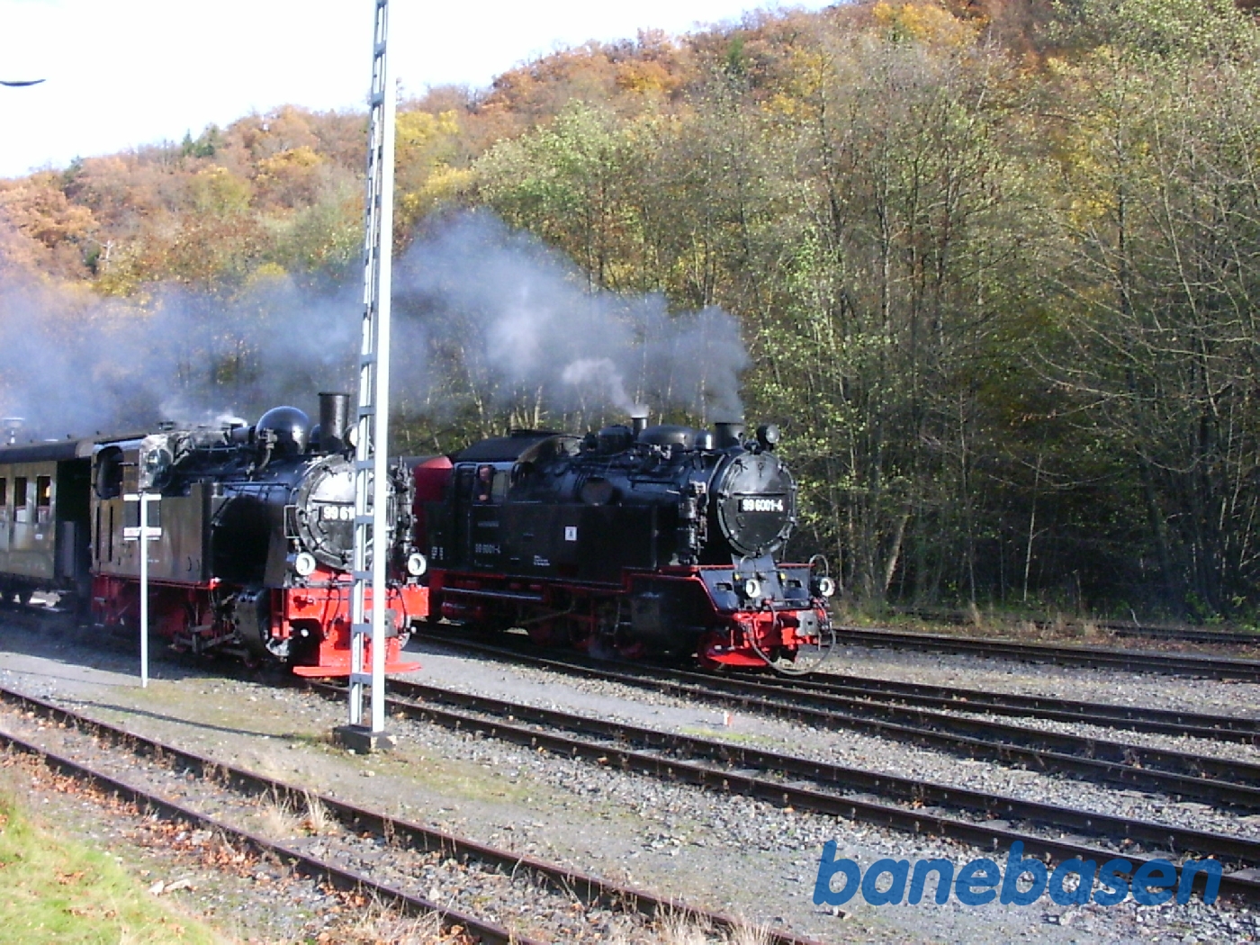 Motiv:Damptoget holder ved perron 1, klar til at køre til Hasselfelde. Toget i spor 2 skal til Harzgerode