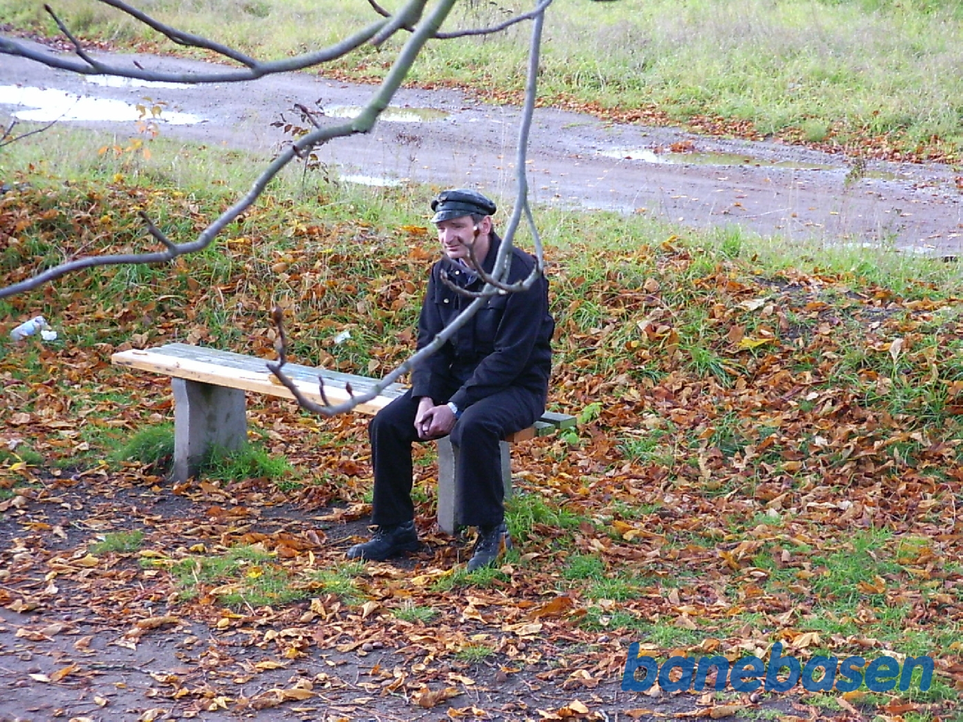Motiv:Træt lokomotivfører sidder på bænk og hviler sig
