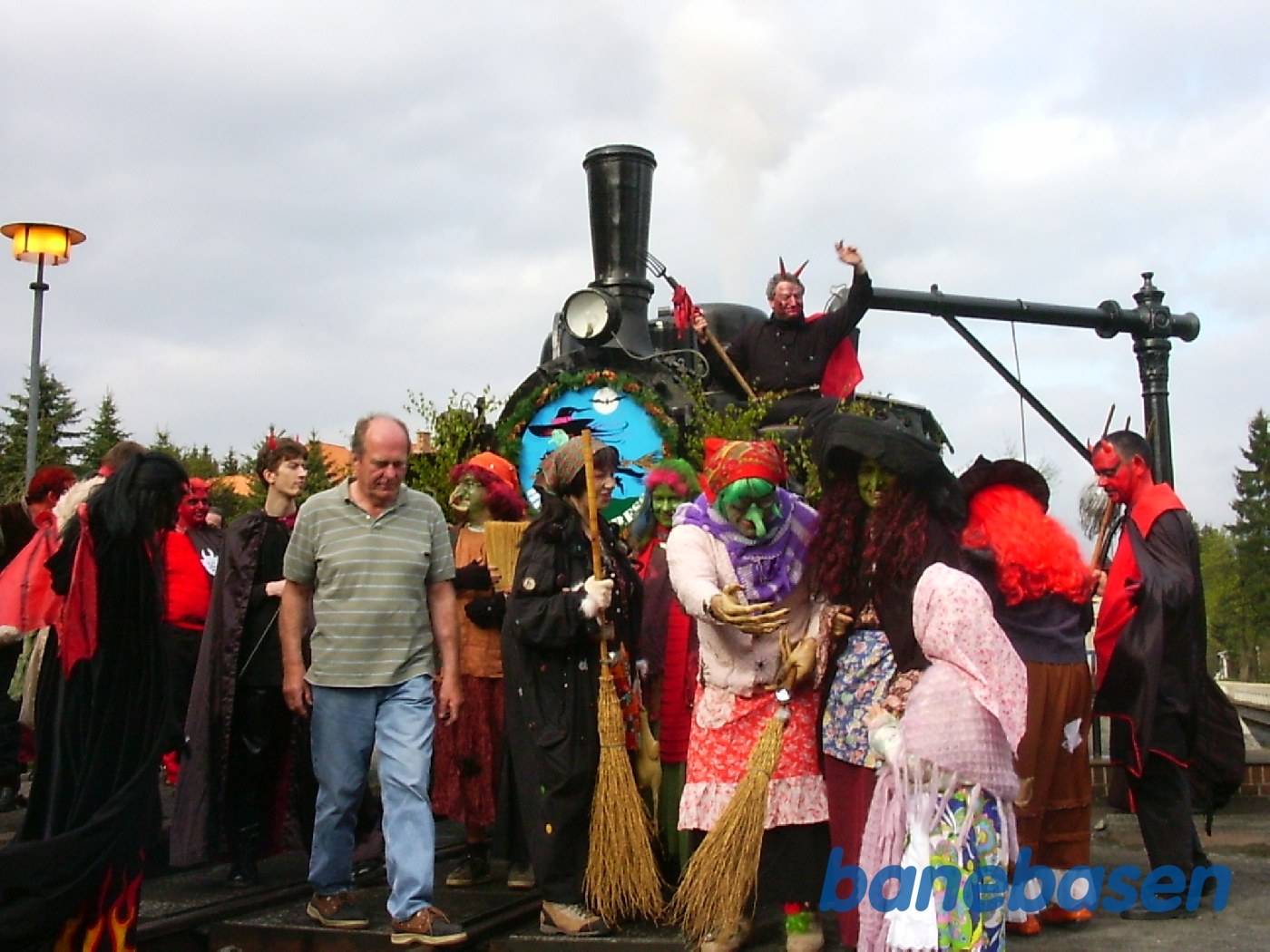 Motiv:Mens lokomotivet får vand på, flokkes de udklædte gæster om lokomotivet