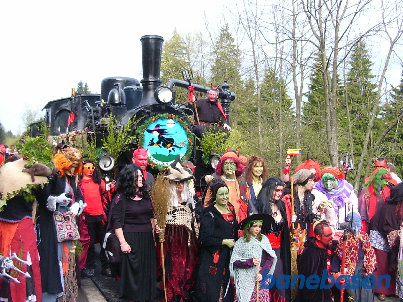 Motiv:Mens lokomotivet får vand på, flokkes de udklædte gæster om lokomotivet