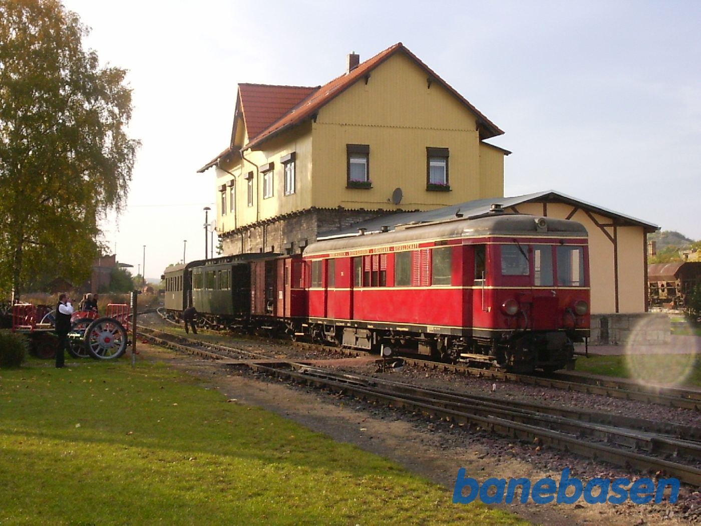 Motiv:Motorvognen er løbet om og toget holder ude på opstillingssporet