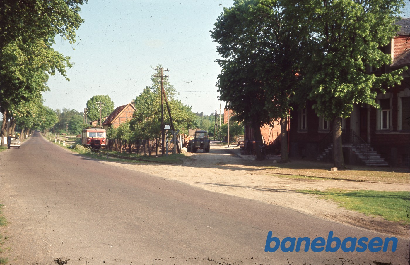 Motiv:Smalsporet motorvogn kører langs landevejen