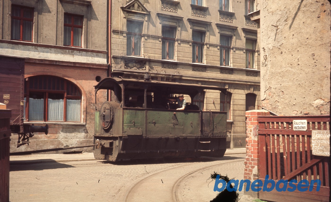 Motiv:Lokomotiv med godsvogne kører gennem byens gader