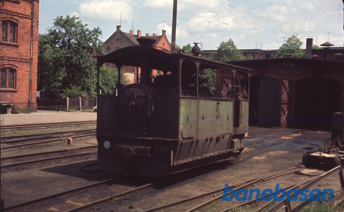 Motiv:Det lille firkantede lokomotiv holder på maskindepotet