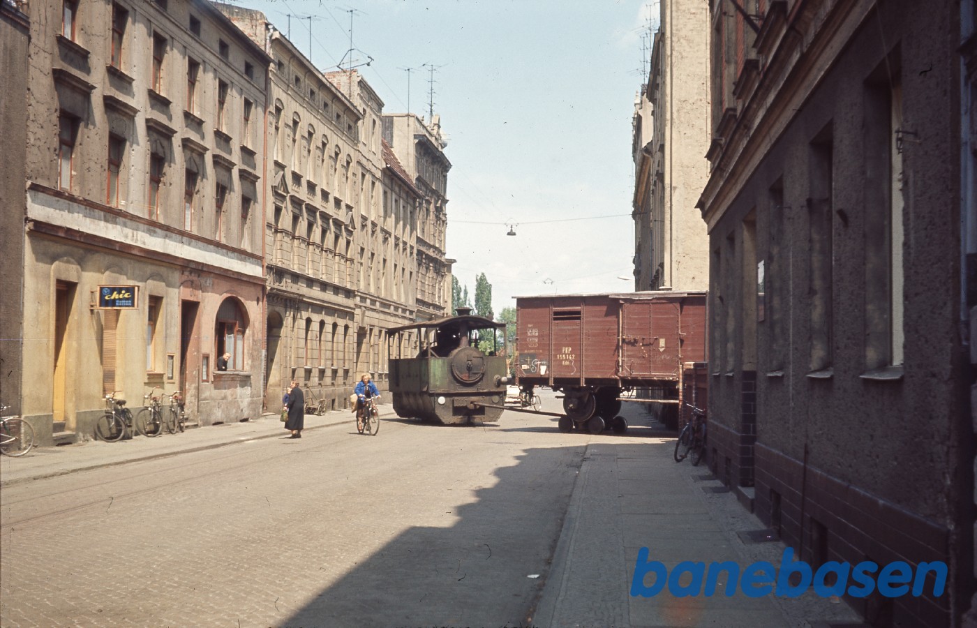 Lokomotiv med godsvogne kører gennem byens gader