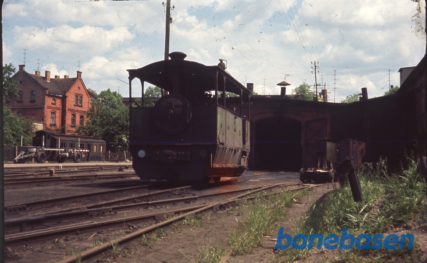 Det lille firkantede lokomotiv holder på maskindepotet