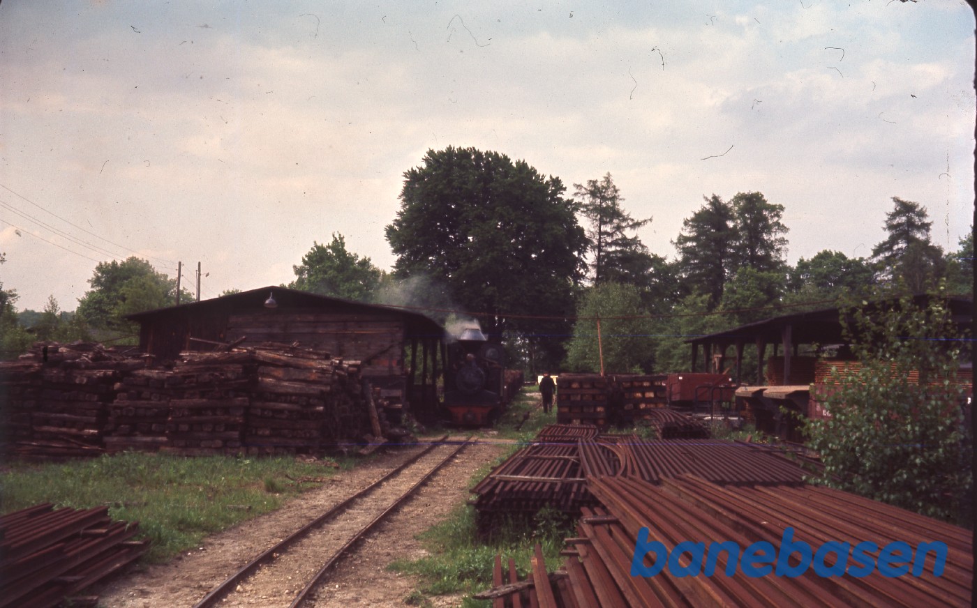 Damplokomotiv rangerer ved depotet for skinner og sveller