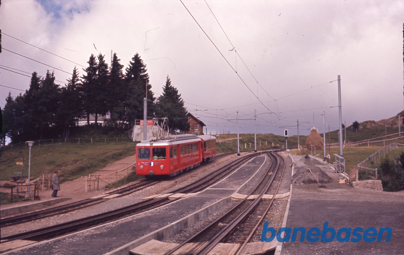 Motiv:Rødt tandhjulstog på vej ned fra bjerget og ind på stationen