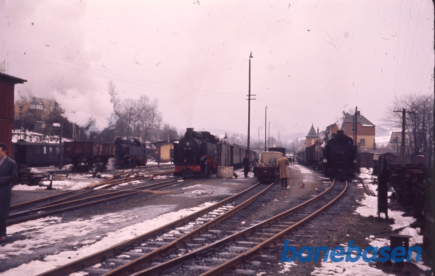 Motiv:Vue ud over stationen med 3-4 damplokomotiver