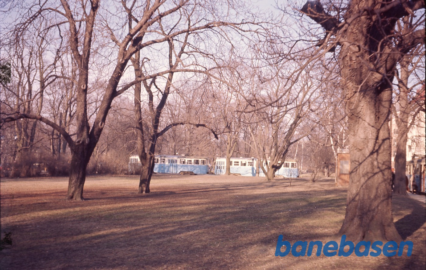 Motiv:Sporvogn ude i et yderkvarter med park