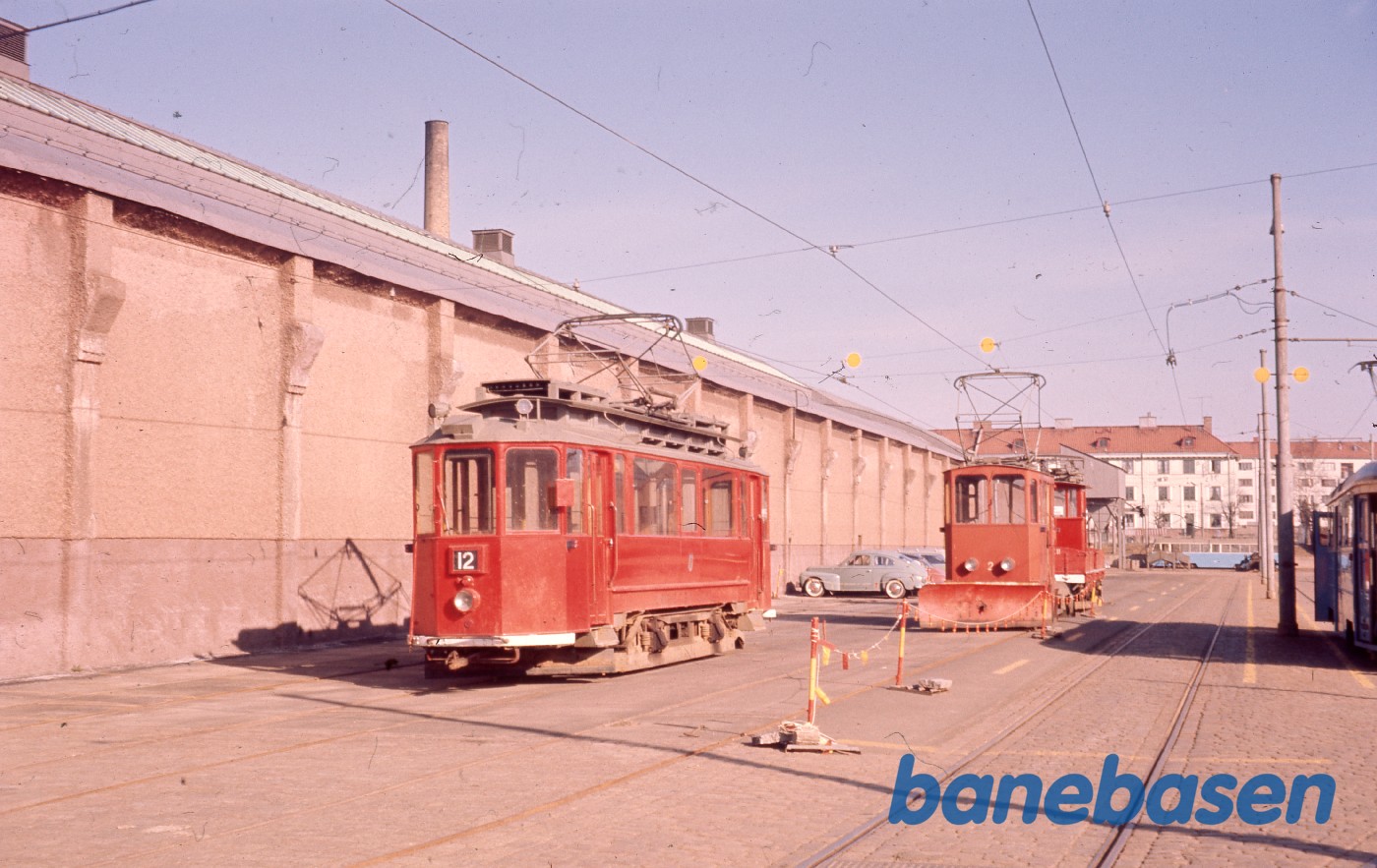 Motiv:Rød sporvogn samt skinneskidtskrabervogne ved remisen