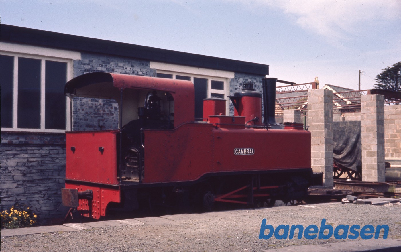 Udstillet lokomotiv. I baggrunden ses udbygningen af vognhallerne ved deres depot