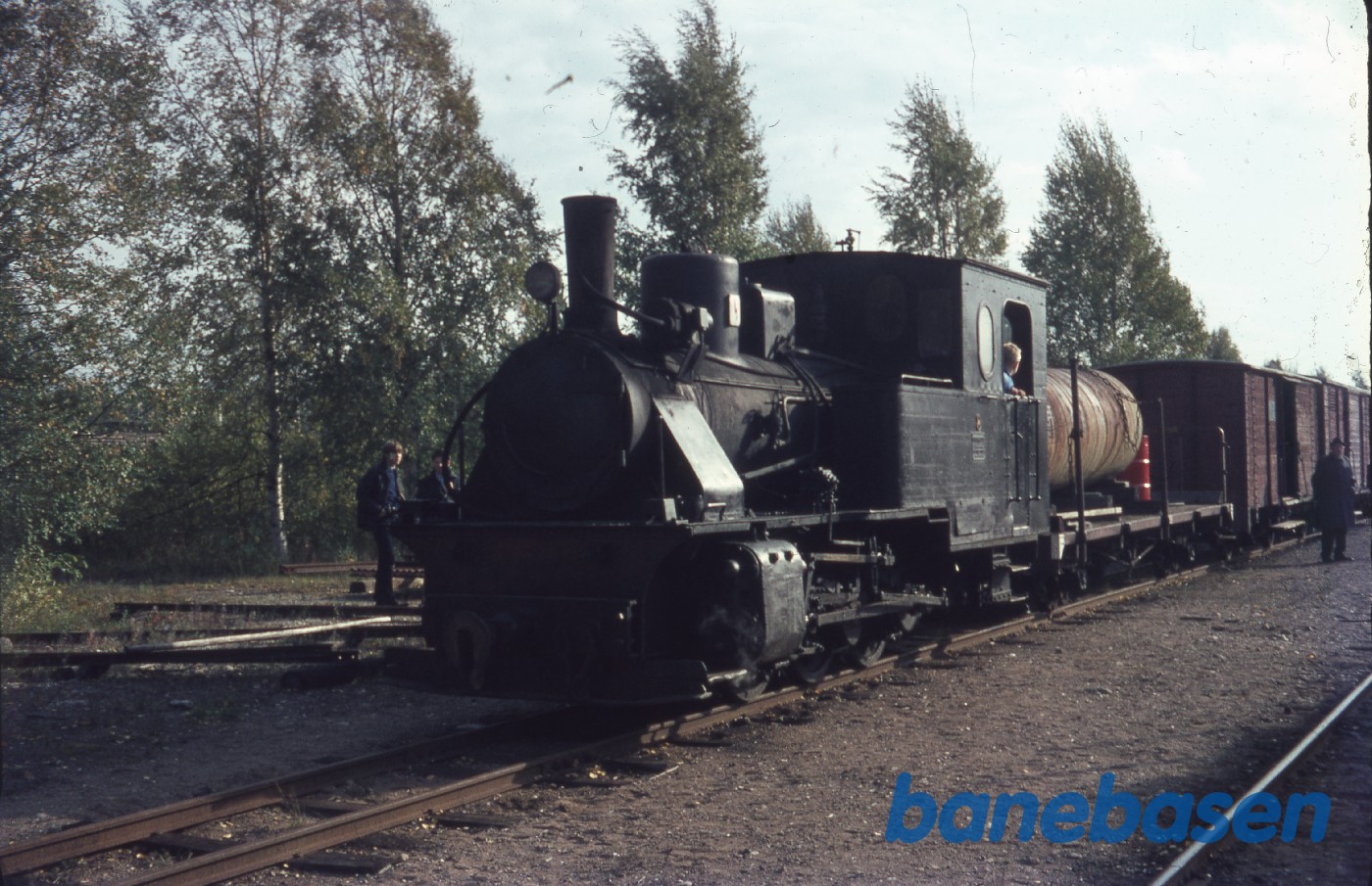 Damplokomotiv med godsvogne i sidesporet